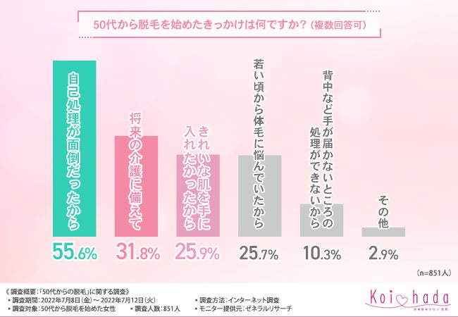 ほかにも50代から脱毛を始めたきっかけの3割以上が、「将来の介護に備えて」と回答しています。
